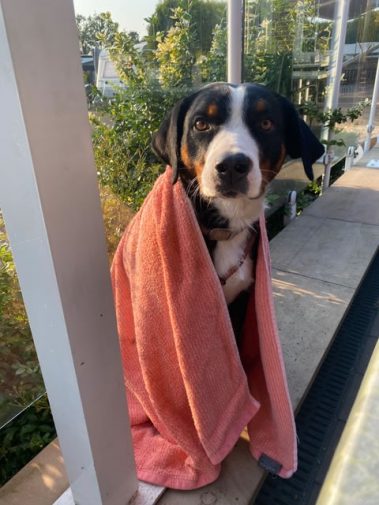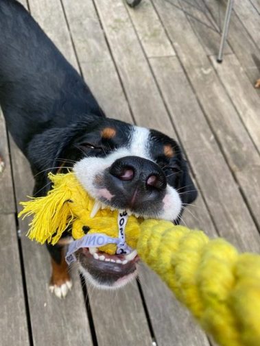 Unsere Appenzeller Babies laufen nicht nur immer sicherer durch die Welt, sondern sie spielen nun auch in jeder Wachphase nach dem Trinken. Miteinander, mit sich selber, mit ihrer Mutter. Letzteres ist besonders rührend zu beobachten. Es entwickelt sich eine echte liebevolle Interaktion zwischen Mutter und Kindern. Dabei sticht besonders Ari hervor, der Anni gerne ins Ohr zwickt, heute Abend auch hier und da ins Gesicht. Anni lässt es bisher geschehen und leckt ihn im Zweifel irgendwann einfach einmal gehörig ab.