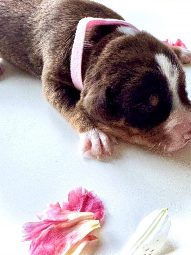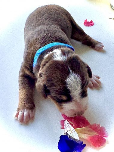 Anni ist kaum aus der Wurfkiste zu bekommen. Zum Gassigehen muss ich ihr eine Leine anmachen, um sie zum Aufstehen zu motivieren. Essen und Trinken muss quasi „im Bett“, als in der Wurfkiste serviert werden. Sie versorgt ihre Babies vorbildlich! Alle haben zugenommen, bis auf Ava. Sie hat ein paar Gramm verloren, war ja aber auch die Größte von allen, so dass sie etwas zum Zusetzen hat.