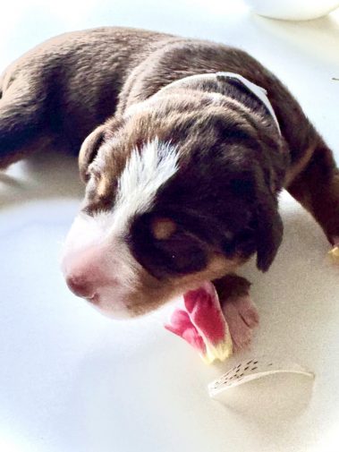UND DANN GEHT ES AUCH SCHON LOS! Und zwar schulbuchmäßig: Kaum Zuhause, setzen die Wehen ein, die Fruchtblase platzt und um 10.52 Uhr wird der erste Welpe geboren – ein Mädchen in havannabraun, recht groß – Ava! Sie ist die Größte von allen.