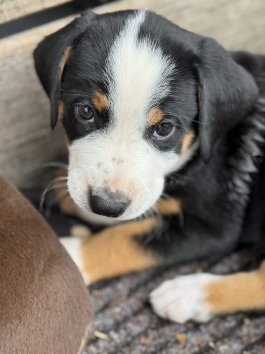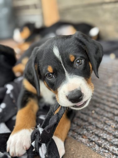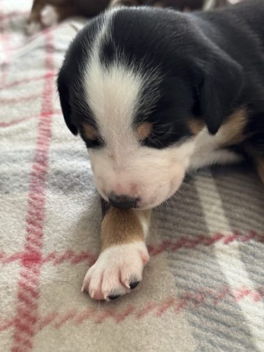 Die Wach-Zeiten unserer Appenzeller Babies werden länger. Sie laufen dann langsam immer sicherer durch die Wurfkiste und fangen auch schon an, miteinander zu spielen. Manchmal sitzen sie aber auch einfach nur so da und schauen herum. Die Welt wird mit dem Mäulchen erkundet – unsere Finger und Hände werden abgelutscht. Bei dieser Gelegenheit wird deutlich: die Milchzähne brechen durch. Das wird eine harte Zeit für Anni werden. Ich leide jetzt schon ein bisschen mit ihr. Aber bisher nimmt sie alles sehr gelassen hin. Wird also bestimmt auch werden…